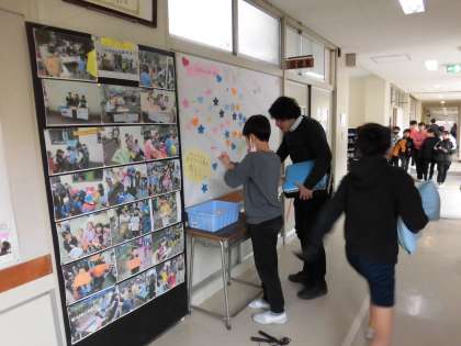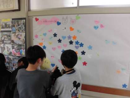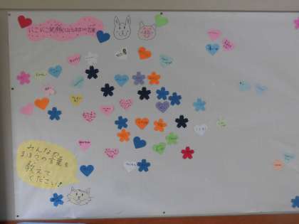 写真は保健室前の掲示板です。みんなが笑顔になる「まほうの言葉」を募集しています。1人の児童が書いていると「何してるの?」とほかの児童も興味を持って、輪が広がります。はじめは数枚しか貼られていませんでしたが、休み時間に友達と書きに来てくれる児童が増えました。「がんばって」「ファイト」「どうしたの」「だいじょうぶ」「すごいね」「いけるいける」人を励ます言葉はこんなにたくさんあるんだと、子どもたちの発想の豊かさに感心しました。読んでいると心が明るくなり、本当に笑顔になりました。