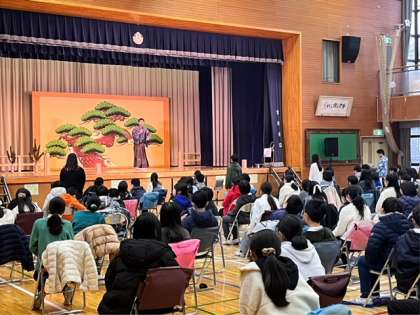 パブリックシアターの方々がおいでくださり「古典芸能鑑賞教室」が開かれました。喜多見小の6年生も明正小に来て、一緒に狂言の「附子」を鑑賞しました。「附子」は、出かける主人から「附子」という毒が入っているから桶に近づかないように言われた家来が桶に入っているのは本当は砂糖と分かり、食べてしまう話です。難しい言葉があるのですが、時々、笑い声が上がりました。ワークショップでは、狂言の「柿の食べ方」や「笑い方」を教えてもらいました。貴重な体験ができました。
