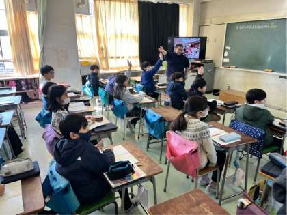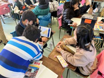 4年生は社会科で東京都の特色のある地域について、大田区を取り上げて学習しています。大田区に住む外国人の人口の変化等の資料から大田区が進めている取組について調べていきます。資料を見て、グループで活発に話し合っていました。