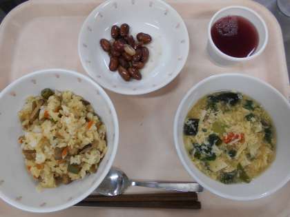 五目ごはん 煮豆 かきたま汁 ぶどうゼリー 牛乳