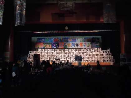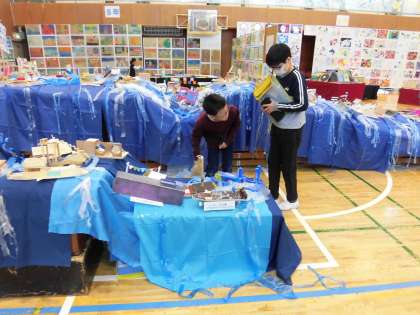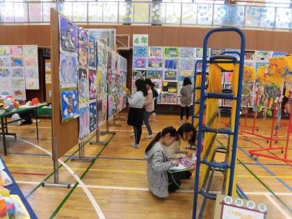 作品展の児童鑑賞の時間には「いいねカード」を書いています。友だちや他の学年の作品を見て、いいなと感じた作品にどんなところがよかったなどを記載します。何枚も書いている子もいました。ひとつの作品を目を輝かせてじーっと鑑賞する姿も見られました。友だち同士で作品に「すごいね〜」「かわいいね〜」と声を掛け合ったり、上級生の作品を見て「自分も6年生になったら、こんなすごい作品作れるのかな〜」とわくわくしながら見る姿も見られました。最後には、舞台上にある6年生の「しろしろワールド」をライトアップをして鑑賞しました。体育館の明かりを消すと子どもたちの「わぁ〜」という歓声が上がり、「遠くで見ると大きな作品に見えるよ!」と幻想的な世界に感動の声が聞こえました。