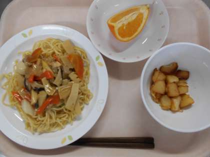 五目あんかけそば じゃがいものからあげ いよかん 牛乳