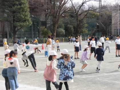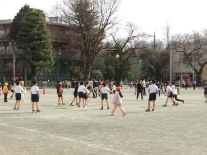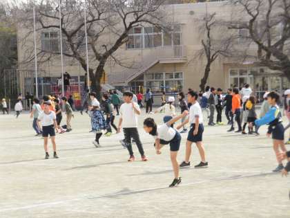 今日は春もすぐそばに感じるようなとても暖かい日です。お昼休みには、多くの子どもたちが校庭で走り回って遊ぶ姿が見られました。ドッジボール・おにごっこ・サッカーなどで、友達と楽しく遊びました。「暑〜い!!」と途中で上着を脱いで遊んでいる姿や、汗をかきながら走り回る姿が見られました。春一番と思われるような強い南風が吹く中でしたが、元気いっぱい走り回りました。