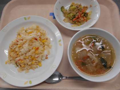 ナシゴレン ツナ入り中華サラダ 白菜と春雨のスープ 牛乳