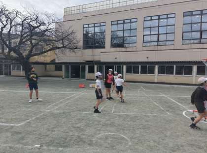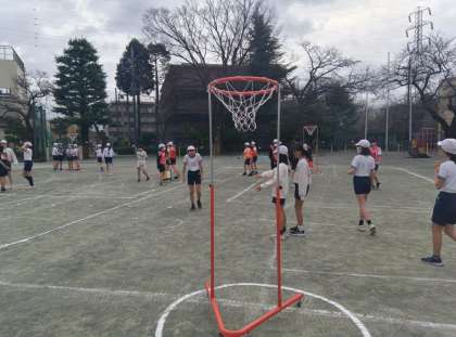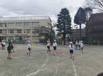 寒空の中ですが、6年生が元気に体育の学習に取り組んでいました。創立70周年を記念して明正小学校同窓会よりいただいたセストボールゴールを活用し、新たな運動「セストボール」を取り入れました。バスケットボールと同様のルールで、360°どこからでもゴールが狙えます。直線的に放つシュートではなく、ふんわりとした軌道のシュートが有効となり、バスケットボールのシュート技能にもつながります。同窓会の先輩方のおかげで、体育学習が更に充実しています。