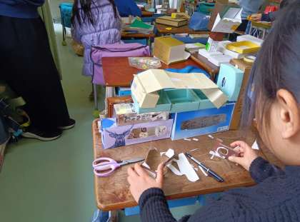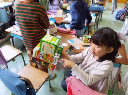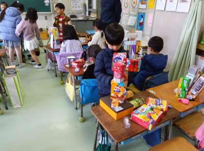 1年生の図工では、お家から持って来た箱を使って工作をしました。いろいろな大きさの箱を組み合わせてお家を作ったり、ロボットを作ったりと、とても楽しそうでした。折り紙で飾り付けをする子もいて、教室の中が華やかになりました。