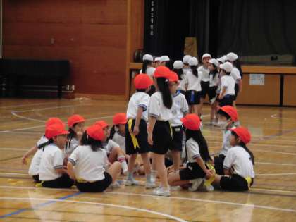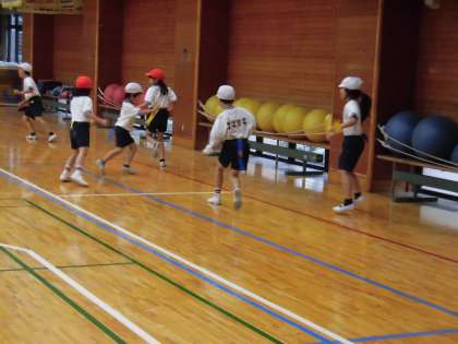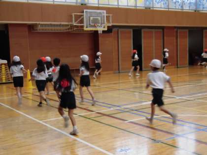 1年生の体育では、持久走、いろおに、しっぽ取りなどのゲームをしています。持久走では体育館の外周を3分間、自分のペースで走り込みました。息切れしながらも「12週走れた!」「ぼくは13周!」と話す様子が見られました。いろおにでは「いろおに、いろおに、なんの色!」の全員の掛け声でおにになった子は大きな声で一つの色を知らせると、いっせいに走り出していました。しっぽ取りでは、2チームに分かれて、まずは作戦会議です。どうやったらおしりにつけたしっぽを取られないようにできるか、相手のしっぽを取るためには…といろいろな意見が出ていました。「絶対勝つぞ!オー!!」と気合十分にゲームが開始されました。とても白熱したゲームになり、楽しみながら、しっかりと体を動かすことができました。