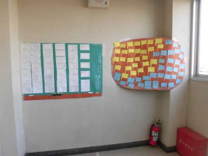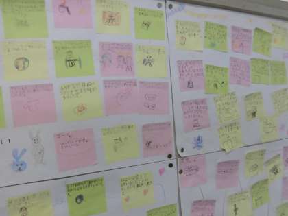 1年生の教室には、1年間の成長をすごろくにした作品が掲示されています。できるようになったこと、楽しかったことなどを思い出しながら書き出しました。制作の段階では、書きたいことがたくさんあって、多くの児童が何枚も付せんをもらっていました。