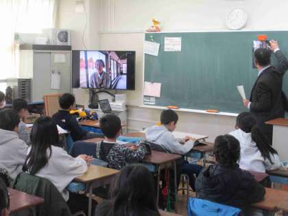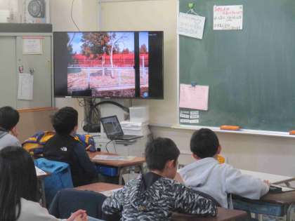 佐渡にある「トキ保護センター」とオンラインでつなぎ、お話を聞きました。子どもたちの質問から、トキの雄雌は、羽根についた血液で調べないと分からないことや、トキの皮膚は赤色をしていること、トキの卵はニワトリの卵より少し大きいことなどが分かりました。たくさんの質問が出てくるので、佐渡の方々も驚いていました。