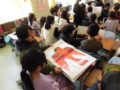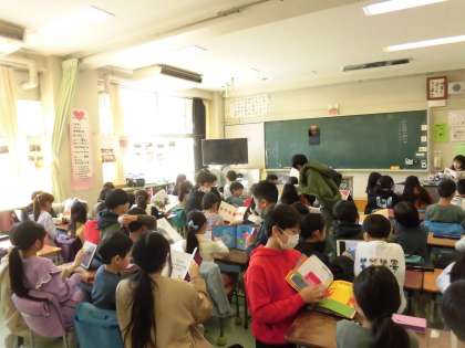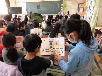 6年生と1年生が「英語絵本の読み聞かせ」の交流を行っています。6年生は英語の絵本の読み聞かせの練習も何度も何度も行ってきました。1年生にわかりやすいように、ゆっくり読んだり、抑揚をつけて読んだり、1年生に目線を合わせしゃがんで読んであげたり、優しい姿が見られました。最初は緊張していた6年生も何度か繰り返すうちに、聞いている1年生も物語の世界に入っていくように見られました。6年生の練習の成果が存分に発揮されたようで、1年生も「楽しかった!」「もっと読んでほしい!」と、とても楽しい交流の時間になったようです。
