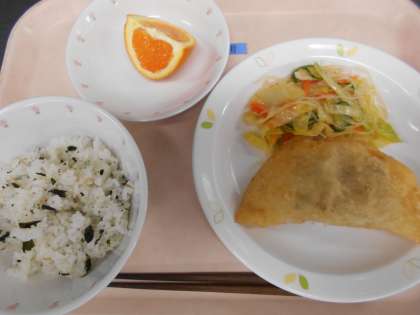 わかめごはん ジャンボぎょうざ 春雨サラダ 清見オレンジ 牛乳