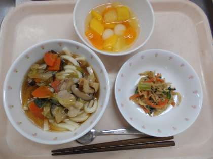 ちゃんこうどん 野菜のごまあえ フルーツ白玉 牛乳