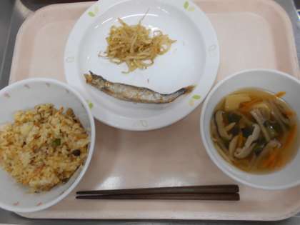 高野豆腐入りそぼろごはん ししゃものからあげ もやしのごま風味