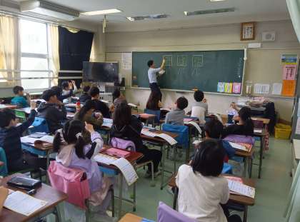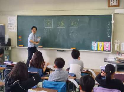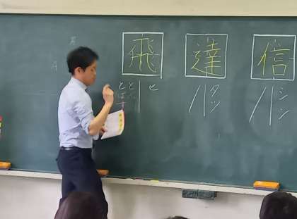 4年生の授業風景、漢字の学習です。4年生の漢字の中でも難しい「飛」空書きをしながら丁寧に指導していました。教室は、やる気に満ちあふれていました。
