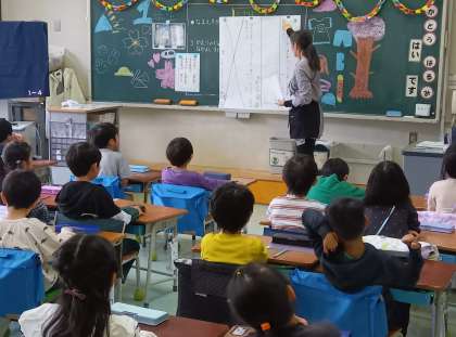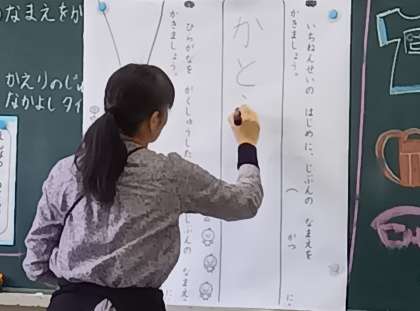 1年生になってはじめて書く名前です。鉛筆の持ち方や真ん中に大きく書くという指導を行っていました。子どもたちは集中して話を聞いていました。
