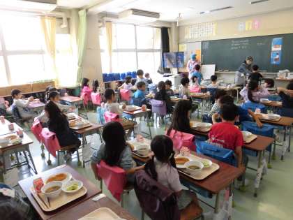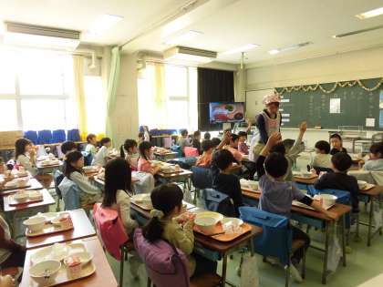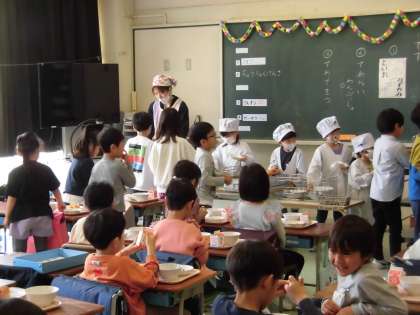 今日から1年生の給食が始まりました。手洗い、配膳のしかた、座って待つ、食べ方、下膳の仕方など、給食の流れをあらかじめ学習しました。当番の子どもたちは、初めて白衣を着て、少し緊張した様子も見られましたが、協力して白衣を着ていました。初めての給食に朝からドキドキワクワクしていたようで、座って待つ子たちにも笑顔があふれていました。
