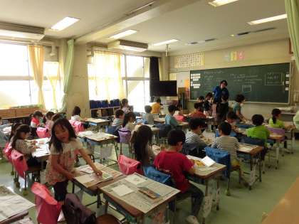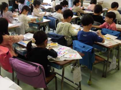 1年生の初めての図工では「すきなものいっぱい」の制作を行いました。好きな食べ物、好きな動物、好きな乗り物、好きな虫など、クレヨンを使って好きなものを好きなように画用紙にたくさん描きました。先生からやり方や約束事をしっかりと聞いてから画用紙を受け取り制作を始めました。少し悩んでいた子も、描き始めると集中して描くことができたようです。楽しい図工の時間となり、カラフルなすてきな作品が出来上がりました。