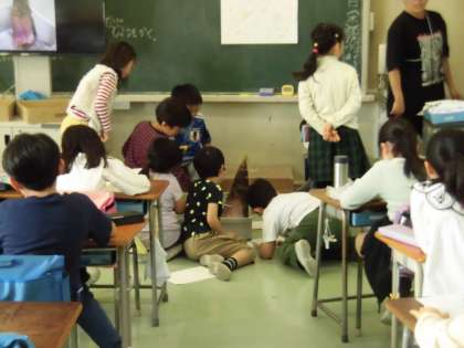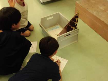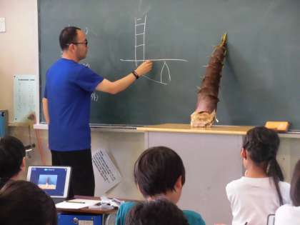 3年生が里山で採れたたけのこの観察を行いました。里山に行き、たけのこがどのように生えているのかを観察し、大きな大きなタケノコをいただいてきました。教室に戻って、観察カードにたけのこの絵を描いたり、色や大きさ、長さなどを調べて記入しました。じっくり見て、触って、においを嗅いだりとじっくり観察する姿が見られました。「思ったよりかたいな〜!」「毛がはえてる!」「こんなに重いの!!」「竹のにおいがする!」などなど、たくさんの発見があったようです。