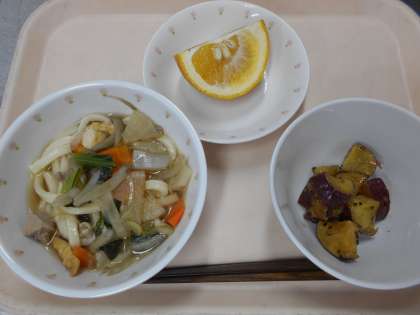 けんちんうどん 大学いも あまなつみかん 牛乳