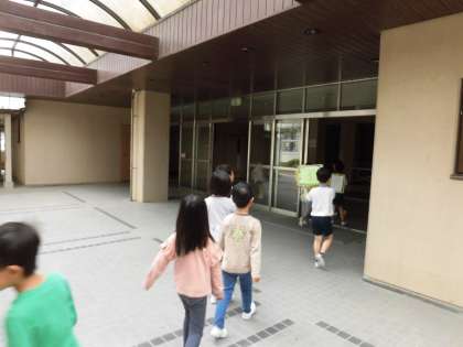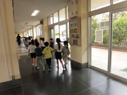 今日は、1年生が2年生に案内してもらいながら学校探検を行いました。2年生は事前に計画したこと、作成した校内地図をもとに、班に分かれて校内を探検しました。2年生は1年生にわかりやすいように班番号の札を常にかかげたり、班がバラバラにならないようにしっかりと手を繋いだり、1年生を優しく見守る姿が見られました。体育館、屋上、職員室も見学し、校長室では校長先生が笑顔で迎えてくれました。歩幅を合わせて歩いたり、1年生が気になった校内の掲示物の内容も2年生が説明したり、とても優しく頼もしい2年生の様子が校内のあちらこちらで見られました。1年生もとても楽しい学校探検になったようです。