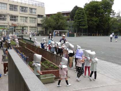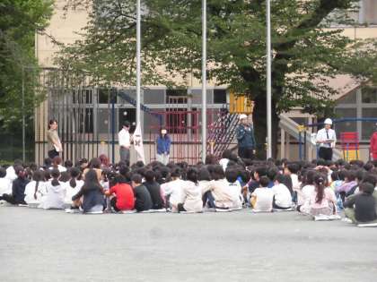 今日は今年度初めての避難訓練を行いました。大きい地震が発生したという想定での訓練でした。地震発生後、教室では机の下にもぐり、校庭では校庭の中央に集まり体をかがめて揺れがおさまるのを待ちました。揺れがおさまったら「お・か・し・も(押さない・駆けない・喋らない・戻らない)」の約束を守って、防災頭巾をかぶり校庭に避難しました。1年生にとっては初めての避難訓練でしたが、しっかりと約束を守り、先生の指示に従って避難することができました。校長先生から、「避難訓練は『自分の命を守るためにする』ものなので、真剣にしっかりとのぞんでほしい」というお話がありました。少しでも早くひとりひとりが避難でき、身を守る行動を身に付けることができるよう、避難訓練に取り組んでいきます。
