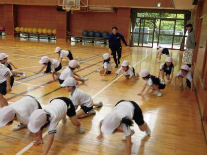 今日は、1年生がコオーディネーショントレーニングを行いました。日本コオーディネーショントレーニング協会の講師の先生をお迎えして、くねくね運動やくの字体操をしました。最後には講師の先生がおにとなり、子どもたちは四つん這いのスパイダーマンになって逃げまわるというおにごっこを行いました。どの運動もとても楽しく、子どもたちも大盛り上がりで楽しく取り組むことができました。コオーディネーショントレーニングは子どもからおとなまで気軽にでき、姿勢や腰痛の改善にも効果的な運動です。子どもと一緒にご家庭で楽しむのもよいかもしれません。