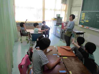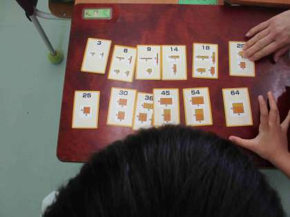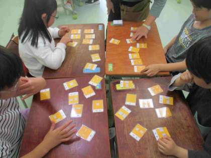 ひまわり学級のあるグループでは、「九九かるた」を使って、学習した九九の復習をしています。「3×3?」と問題が読まれると、「9!」と元気よく答えの札を取っていました。友達と楽しく復習をすることができました。