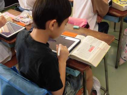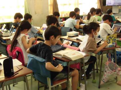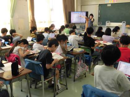 4年生の国語では「漢字辞典」を使う学習をしています。漢字辞典で漢字の読み方や成り立ち、意味、部首、画数、そしてその漢字を使った語句も調べることができることを学習しました。索引にも「音訓索引」「部首索引」「総画索引」の3種類の引き方があることも学習できました。実際に漢字辞典を使って、いくつかの漢字を調べたり、部首がさんずいの漢字を辞書で調べました。漢字や言葉を辞書で調べる方法を学習し、辞書を使う楽しさもを身につけることができました。