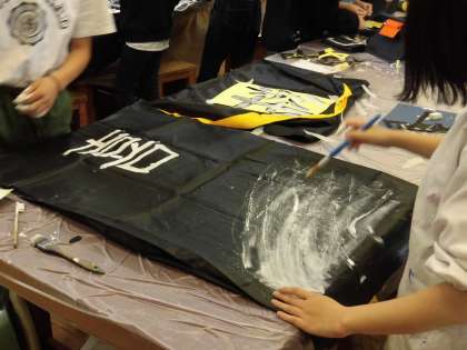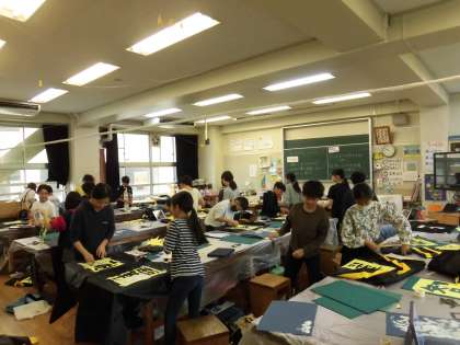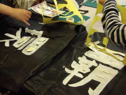 5年生の図工では、運動会で使用するはっぴの制作を行っています。ソーラン節での自分の踊りをイメージして好きな文字を決めて、カッターで細かいところもきれいに型抜きし、型紙を作りました。はっぴに型紙を固定して文字の部分にスポンジで色をのせていきました。そして大胆かつ丁寧に波を描きいれました。波は筆やブラシを使用したり、手がたで波を表現する工夫も見られました。黒いはっぴに白い文字と波が浮かび上がり、どれも迫力あるはっぴになりました。楽しみながら、「よしっ!」「やった!うまくいった!!」と目を輝かせながら制作をすすめていました。本番では、迫力あるソーラン節の踊りだけではなく、ひとりひとりのはっぴにもご注目ください!