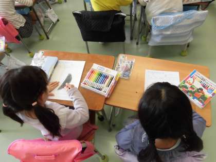 1年生の生活ではあさがおの観察が始まりました。今日はあさがおの種の観察を行いました。小さい種をじっくりと見ながら観察カードに鉛筆やクーピーを使って絵を描きました。色は真っ黒や濃い茶色、形はとがっているところや平らなところ、凸凹しているところがあるなど、発見したことを発表しました。種がとても小さくびっくりしている様子も見られました。これから種をまき、成長を観察します。あさがおを栽培し観察することもいっそう楽しみになりました。