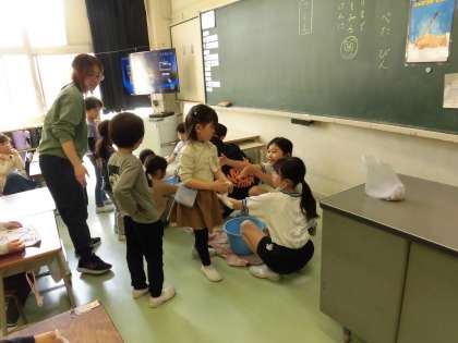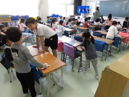 今週の生活目標は「協力してそうじをしよう」です。掃除の時間、1年生の教室では6年生が雑巾の絞り方、机の拭き方、ほうきの使い方などを1年生に教え、一緒に掃除をしました。6年生が丁寧に協力して掃除する姿は、1年生の良いお手本になっているようです。みんなで協力して活動することの大切さもしっかりと学びながら、教室をピカピカにすることができました。
