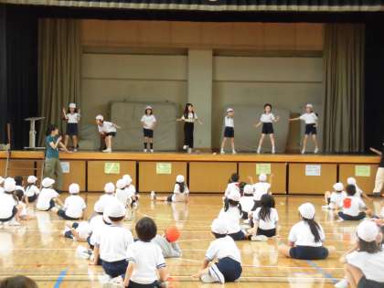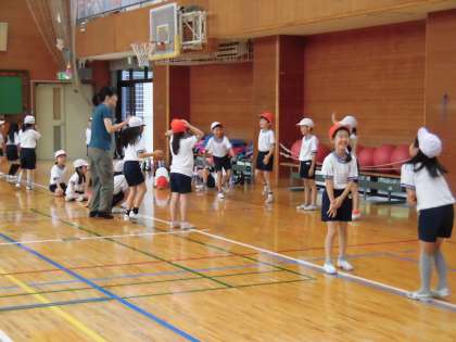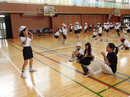 はじめは周りの様子をうかがうばかりで、なかなか体が動きませんでした。教員の手拍子に合わせたり、友達どうしでアイデアを出し合ったりしているうちに、だんだん大きな動きができるようになってきました。何人かの児童がお手本となって壇上で踊ると、拍手が起こり、そのあとの自主練習では踊りのバリエーションが増えていきました。練習が終わるころにはどの児童も笑顔が見られ楽しそうでした。
