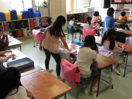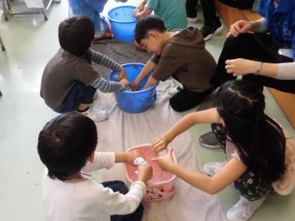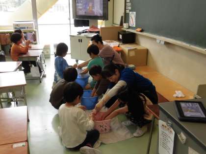 1年生が生活の時間に「雑巾しぼり」の方法を学習しました。雑巾をぬらし、まるめて絞るのではなく、手をひねりながら絞る方法をしっかと覚えました。先生に合格をもらえるように、一生懸命にギュッギュッと絞っていました。上手に絞れるとニコニコの笑顔が見られました。自分で絞った雑巾で自分の机もきれいに水拭きしました。
