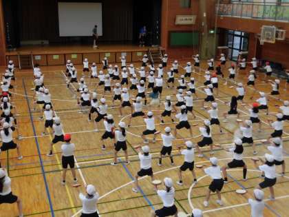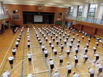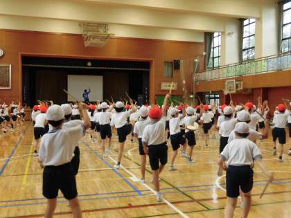 4年生の運動会練習では、沖縄の伝統芸能エイサー「ミルクムナリ」の踊りを練習しています。複雑な踊りもどんどん覚え、全体がそろってきました。手に持ったパーランクーという太鼓を踊りながら打つもの上手になり、音がきれいにそろうようになりました。パーランクーをたたく音が体育館に響き、心地よく感じられました。休憩時間にも、踊りを確認しあったり、協力し合う姿が見られました。