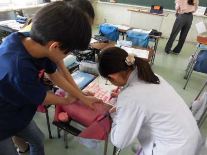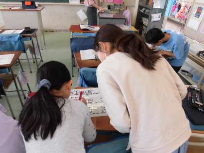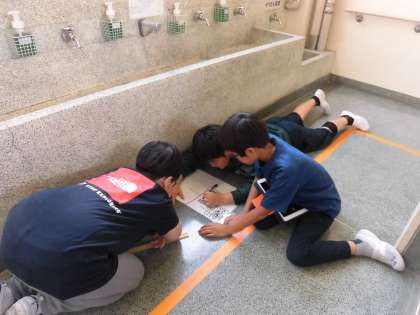 5年生の算数では「比例」の学習をしています。今日は先生から「比例を使って学校にあるものの数を求めよ!!」というミッションが出されました。グループに分かれて、例えば「ロッカー1段の高さをはかり、2段になると…、3段になると…」と段数が変わるごとの高さの変化について、表にまとめました。その他にも、階段や窓枠などの数の変化に伴う高さの変化について調べました。表にまとめることで変わる様子や関係性もとらえやすくなりました。そして、その関係を〇や□を使い、式に表すこともできました。先生からのミッションに、グループで協力して、積極的に取り組む姿が見られました。