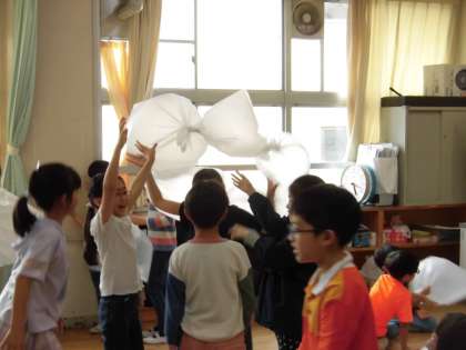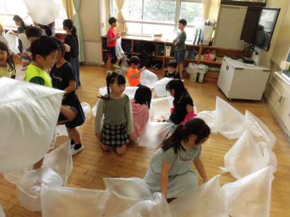 3年生の図工では「ふわふわ空気」の学習をしています。大きなビニール袋の口を大きく開け、空気をたくさん入れて、口をテープでとめました。友だち同士でアイディアを出し合い、膨らませたビニール袋をつなげてみたり、積み木のように積んだりしました。フワフワした心地よさを感じながら、つなげ方や積み方を工夫していろいろな形を作りました。フワフワの大きなビニール袋が教室いっぱいに広がり、教室からはとても楽しそうな声が聞こえていました。