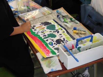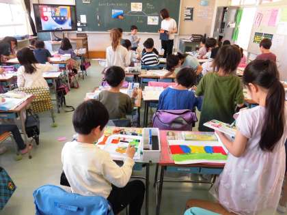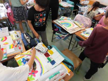 2年生の図工では「えのぐじまの世界を描く」学習をしています。絵の具を使ってひとりひとりが創造した島を自由に描いていきました。思いえがいた島を上・下・横から見たらどんな島かな〜と考えながら、画用紙に描くことができました。「にじの島!」「花火の島!」「虫とにじの島!」「おかしの島!」「サッカーボールの島!」「よくわかんない島!」などなど思いのままにのびのびと描き、不思議な島がたくさんできました。