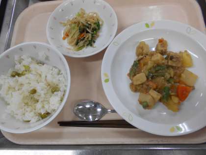 じゃこ入りグリンピースごはん 新じゃがのそぼろ煮