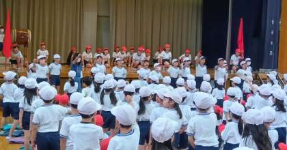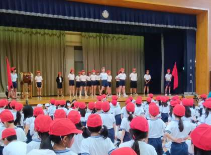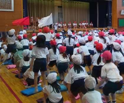 運動会全体練習、応援合戦です。それぞれの団員が大きな声で応援を盛り上げていました。応援歌や応援の仕方が工夫されていました。ウェーブでは、全校児童が一体となり応援する気持ちが盛り上がりました。