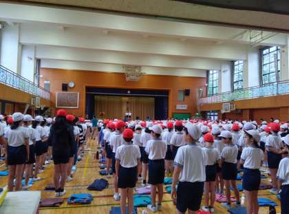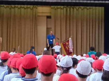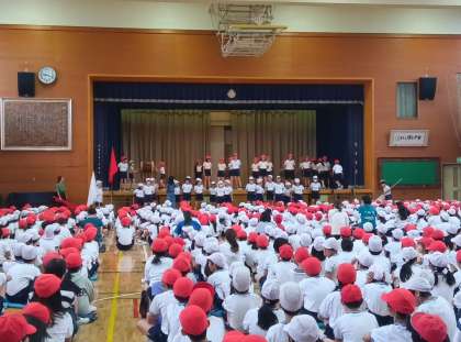 今日は開会式、閉会式の練習をしました。優勝旗、準優勝杯の返還や授与、結果発表、代表の言葉、運動会の歌などを練習しました。応援練習も行いました。