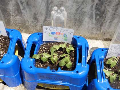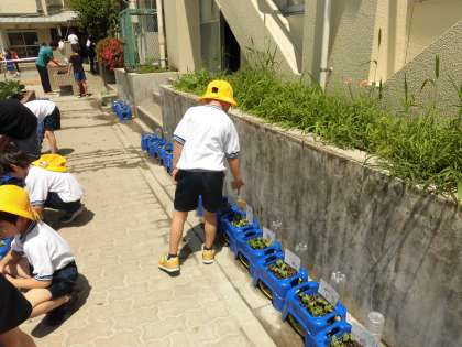 1年生が種を植えたあさがおの芽がたくさん出てきました。今日もしっかりと水やりしていました。「あー、元気がなくなってる!お水、お水!!」と急いでペットボトルじょうろで水やりをしている姿もみれました。自分で植えたあさがおにメッセージや絵をかいたネームプレートも作成しました。とても素敵なメッセージであふれています。