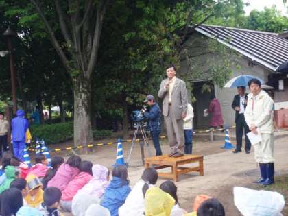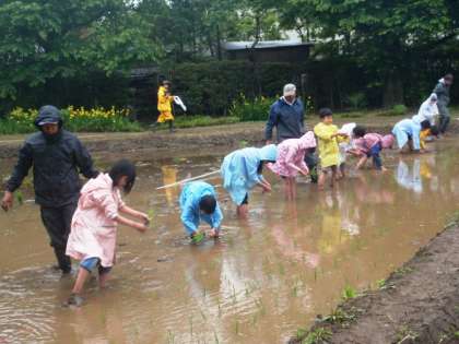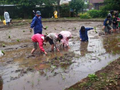 小雨混じる中、5年生は次太夫堀公園にある水田で、田植えの体験をしました。毎年、この時期に行われている区のイベントです。保坂区長も視察に見え、子ども達の前でのあいさつもありました。参加を予定している学校がいくつか取りやめたため、例年よりも広い場所の田植えとなりました。