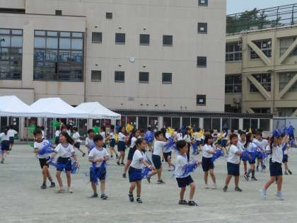 2年生はダンスホールの曲にあわせてキレキレのダンスを見せてくれました。初めの整列もビシッとまっすぐにならび、隊形移動もきれいにできました。腕に着けたカラフルなフリンジが踊りに合わせてきれいに揺れていました。