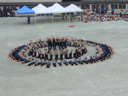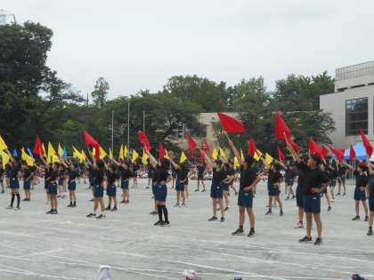 最後は6年生がフラッグを使い素晴らしい演技を見せてくれました。フラッグの動きも息の合ったもので、一体感を感じます。組体操も力強さもしなやかさもある演技に、鑑賞している1年生から5年生からも「すごい!」「おー!!!」と歓声があがりました。さすが6年生です