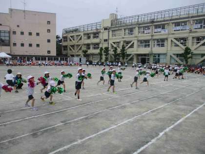 1年生は、クラスカラーのポンポンをつけて、元気に踊りました。曲の途中では、ペアの二人で考えたフリーダンスがあります。