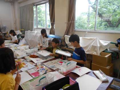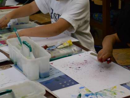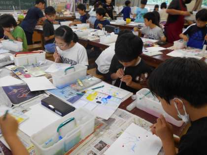 4年生の図工では絵の具の使い方や、絵筆だけではなく様々な道具を用いた技法で絵を描く方法を学び、絵の具に親しむ学習をしています。ポタッと画用紙に落とした水分を含ませた絵の具にストローで息を吹きかけ模様を生み出す方法、トレーの中に敷いた画用紙の上に絵の具を絡ませたビー玉をコロコロ転がして模様を生み出す方法、歯ブラシのようなブラシに絵の具をつけて指ではじくようにこすり、霧吹きのように絵の具を散らして模様を描く方法などを学びました。水の量や、吹きかける力や向き、ブラシをこする強さや方向により、違った模様を描くことができることも学びました。絵の具がまるで生きているかのように動き出し、「すごい!きれい!」「もっとやってみたい!」と目が輝いていました。どんな模様が生まれるか、ドキドキワクワクしながら楽しく学習できました。