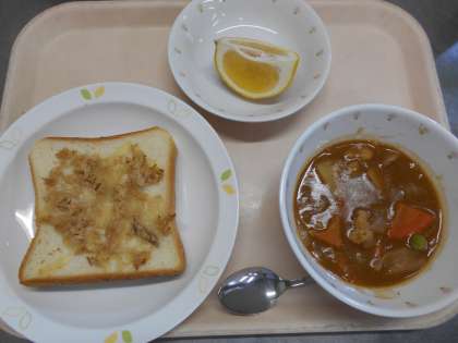 ツナメルトトースト ポークシチュー かわちばんかん 牛乳