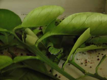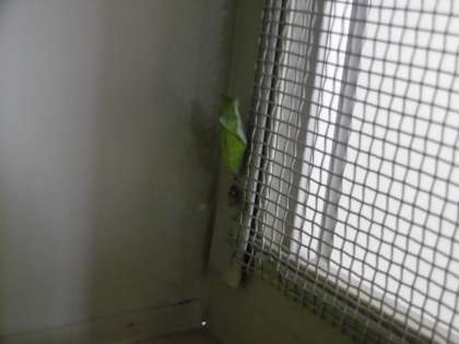 教室近くの廊下では、アゲハチョウの幼虫を育てています。そのなかの1匹が最近さなぎになりました。順調に育てば、10日から2週間ほどで成虫になります。