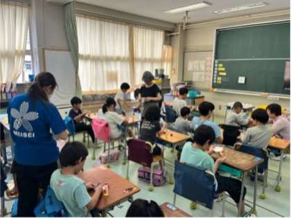 ひまわり学級の皆さんが図工で工作をしています。細く切った色画用紙を細かく折り重ねていきます。すると、ビョンビョンとバネのような、カラフルな虫のような、不思議な物ができました。伸ばしたり縮めたり、並べてみたりと楽しそうです。それを丸い厚紙に貼り付けました。ペンダントのようで、きれいです。これからどんな作品ができるのか楽しみです。