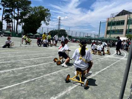 2年生の「山あり谷ありリレー」です。縄跳びやネットくぐり、最後は三輪車でゴールです。たくさんの卒業生が声をかけてくれたり手を振ったりしてくれました。とてもうれしいです。また明正小に会いに来てくださいね。
